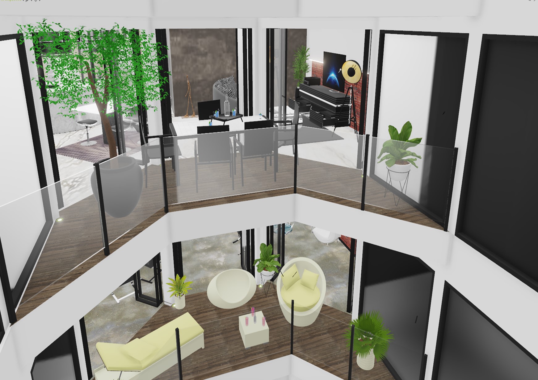 - éclairage complémentaire différentiel avec led intégré dans le seuil du garde corp vitré,